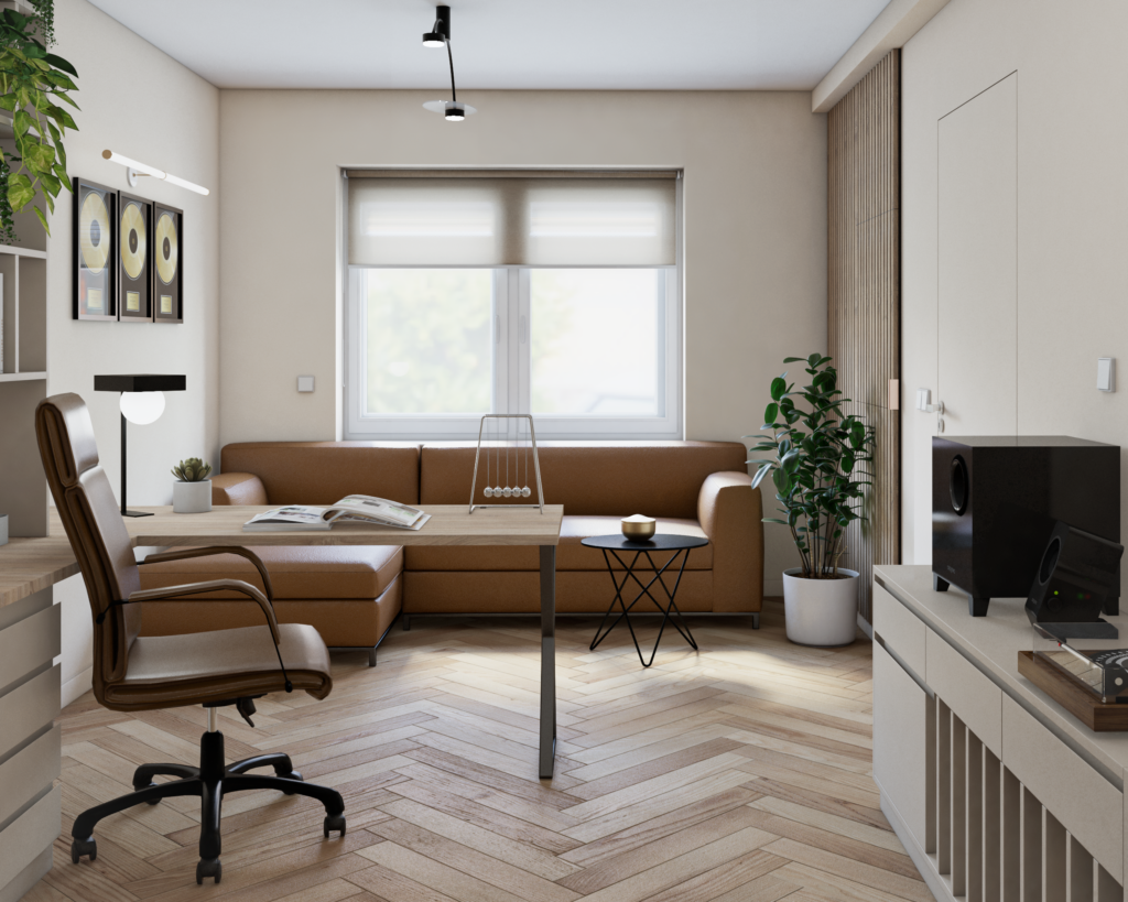 Model 3D z propozycją układu mebli, oświetlenia, kolorystyki i wykończeń